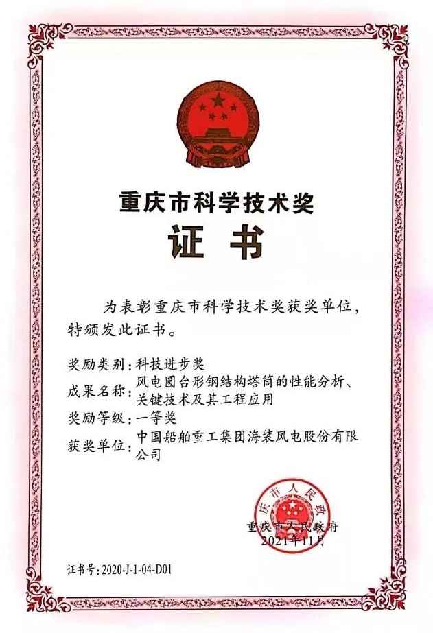 中國船舶集團旗下中國海裝申報的兩項成果《高效安全大型風電機組傳動鏈關鍵技術與應用》《風電圓臺形鋼結構塔筒的性能分析、關鍵技術及其工程應用》榮獲重慶市科技進步獎一等獎。