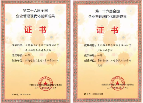 所屬江南造船(集團)有限責任公司申報的《老牌軍工企業基于模型定義的數字造船新模式構建與實施》和中國船舶工業綜合技術經濟研究院申報的《大型船企聚焦國際競爭的知識產權戰略管理》分獲國家級一等獎。本屆僅有30項一等獎,另有4項成果榮獲國家級二等獎,獲獎成果數量創船舶行業歷年最好成績。