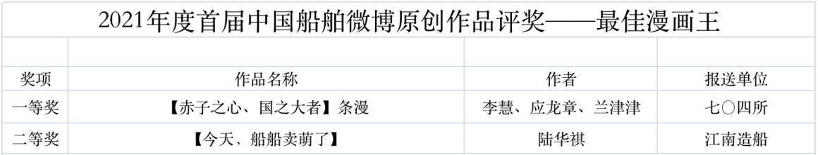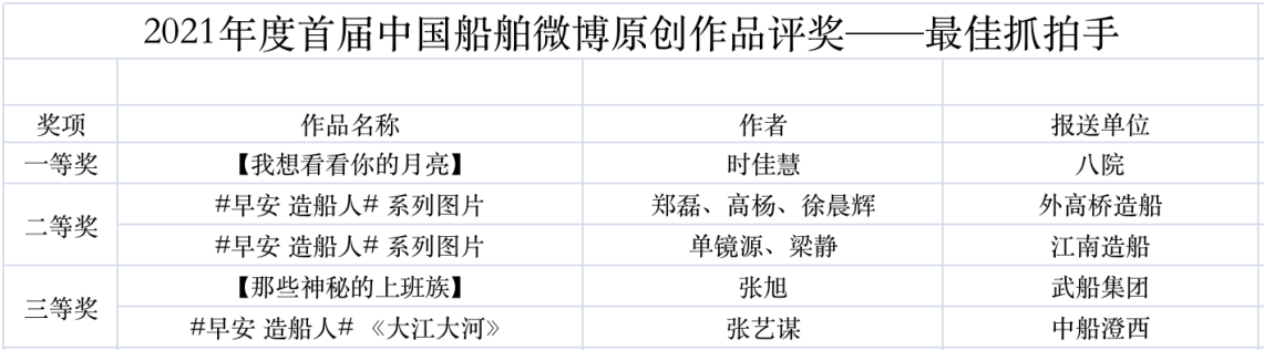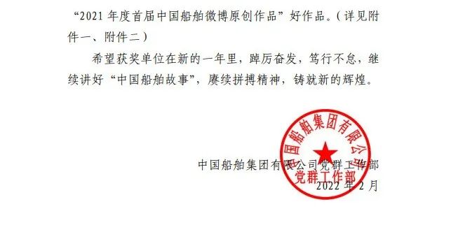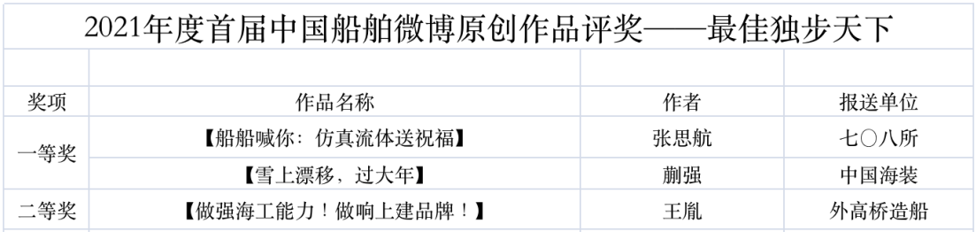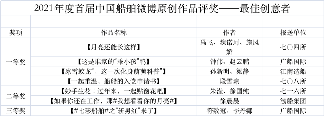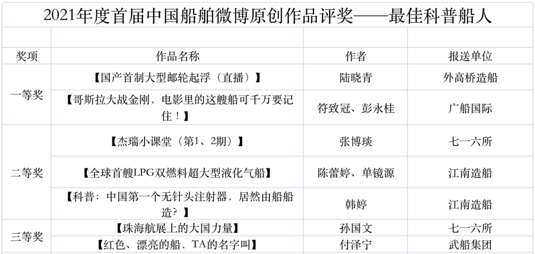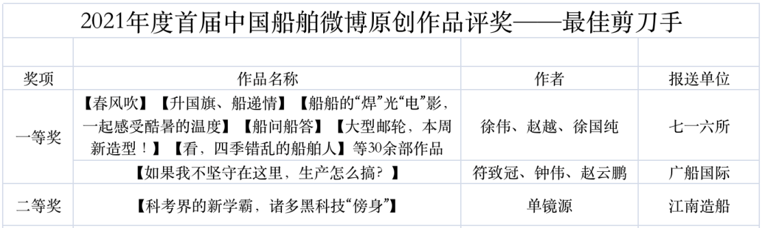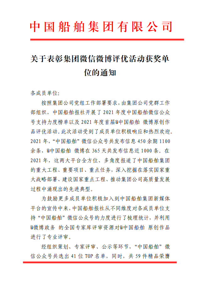 為鼓勵(lì)更多成員單位積極加入到中國船舶集團(tuán)新媒體平臺的宣傳中來,在集團(tuán)公司黨群工作部的指導(dǎo)下,中國船舶報(bào)社從不同維度,對2021年度各單位支持“中國船舶”微信的力度進(jìn)行了梳理統(tǒng)計(jì),并利用微博政務(wù)的全國專家?guī)煸u審資源,對2021年度“中國船舶”微博原創(chuàng)作品進(jìn)行了專業(yè)評審,評選結(jié)果公布如下: