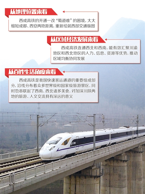 從地理位置來看,西成高鐵將一改“蜀道難”的困境,大大縮短成都、西安兩地距離,重新繪就西部交通版圖。從區(qū)域經(jīng)濟(jì)發(fā)展來看,西成高鐵連通西北和西南,能有效匯聚川渝地區(qū)和西北地區(qū)的人力、信息、資源等優(yōu)勢(shì),推動(dòng)區(qū)域均衡協(xié)同發(fā)展。從百姓生活角度來看,西成高鐵是我國(guó)快速客運(yùn)通道的重要組成部分,沿線分布著眾多世界級(jí)和國(guó)家級(jí)旅游景區(qū),對(duì)加深川陜兩地的旅游、人文交流具有深遠(yuǎn)的意義。