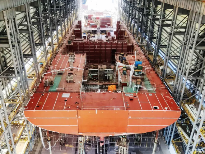 ▲機艙成型,室內船臺生產流程基本打通