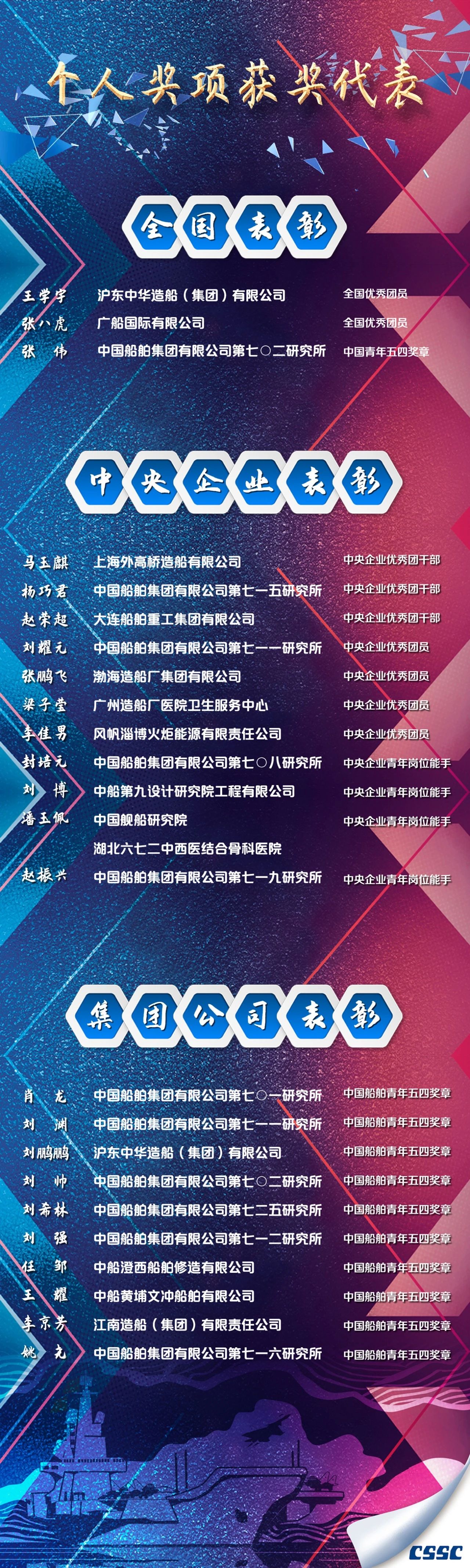 8月19日,中國(guó)船舶集團(tuán)有限公司召開(kāi)表彰會(huì)議。會(huì)上宣讀了2021年集團(tuán)公司團(tuán)員青年獲得全國(guó)和中央企業(yè)榮譽(yù)的情況通報(bào),以及集團(tuán)公司黨組頒授首屆“中國(guó)船舶青年五四獎(jiǎng)?wù)隆钡臎Q定。