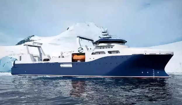 ????“深藍(lán)號”由黃埔文沖建造,七〇八所參與設(shè)計,總長約120米,型寬21.6米,設(shè)計吃水7.3米,設(shè)計航速15節(jié),主機功率8000 千瓦,載重噸約5000噸。“深藍(lán)號”是我國自主研制建造的第一艘漁業(yè)捕撈加工一體船,也是目前最大最先進的漁業(yè)捕撈加工一體船,取得近200項知識產(chǎn)權(quán)保護,實現(xiàn)了我國現(xiàn)代化漁業(yè)船舶裝備領(lǐng)域的重大突破,達到世界先進水平;主要用于南大洋漁業(yè)捕撈,兼顧海洋科考功能,可滿足ICE-A冰區(qū)(冰厚度0.8米)及-25℃低溫環(huán)境的營運要求。