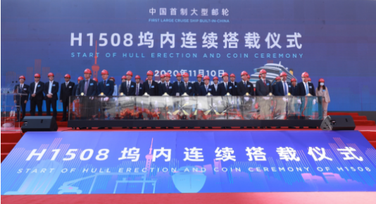 大型郵輪工程是中國船舶集團貫徹習近平總書記重要指示精神、落實國家戰略、滿足人民美好生活需要的重大舉措,也是中國船舶集團強化科技創新、促進轉型升級、推動高質量發展的一號工程。2018年11月6日,中國船舶集團與美國嘉年華集團、意大利芬坎蒂尼集團在首屆中國國際進口博覽會上正式簽訂2+4艘13.5萬總噸Vista級大型郵輪建造合同,并舉行了中國船舶集團大型郵輪項目工程正式啟動儀式。這是我國首次簽訂真正意義上的大型郵輪建造合同,開啟了中國船舶工業建造大型郵輪的新時代。2019年10月18日,中國首制大型郵輪在外高橋造船正式開工點火進行鋼板切割,全面進入實質性建造階段。一年多來,在中國船舶集團的堅強領導下,在中船郵輪科技發展有限公司、中船第九設計研究院工程有限公司、上海船舶工藝研究所等兄弟單位的大力支持下,外高橋造船經受住了新冠肺炎疫情的洗禮和考驗,克服了物資采購、薄板車間流水線建設滯后等一系列困難,一步一個腳印,如期實現了塢內連續搭載總裝的里程碑節點。