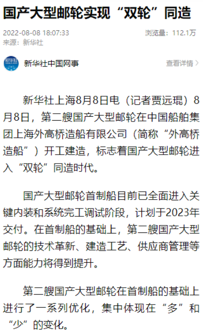 8月8日,第二艘國產(chǎn)大型郵輪在中國船舶集團旗下外高橋造船開建,這標志著中國船舶工業(yè)已初步掌握大型郵輪設(shè)計建造關(guān)鍵核心技術(shù)。